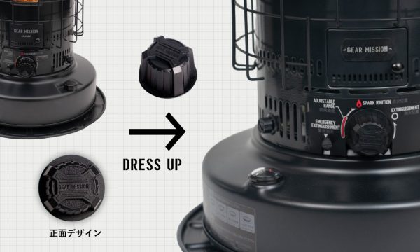 マットな質感とオリジナルデザインがGEARを次のステージへ引き上げてくれるカスタムパーツ。石油ストーブという火器の特性を十分に理解したトヨトミが、安全性を最優先に開発したカスタムパーツとして製品化。独自カスタマイズに伴うリスクを排除し、70年以上の技術力に裏付けられたメーカーの安心品質で、理想のブラック仕様を実現できます。
