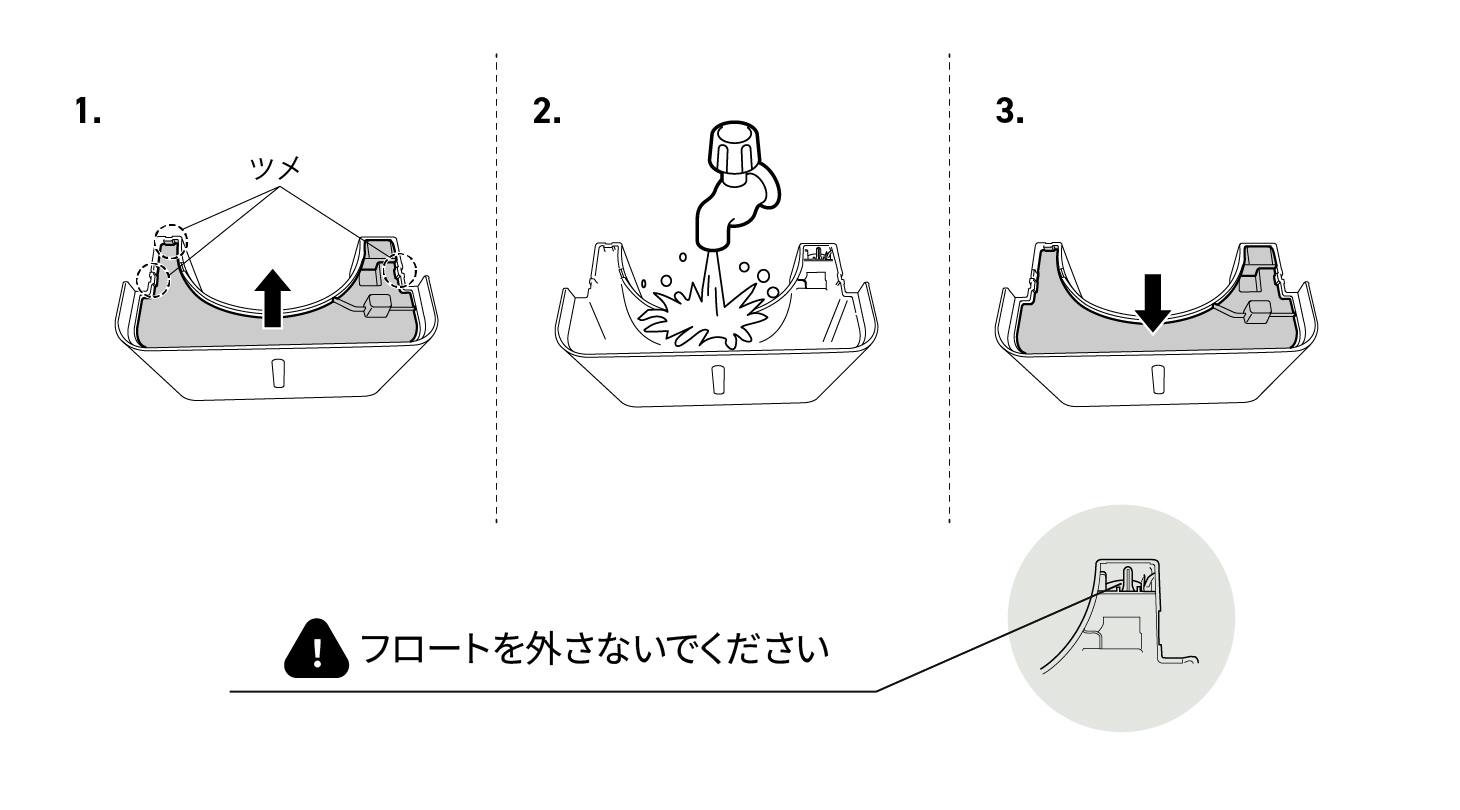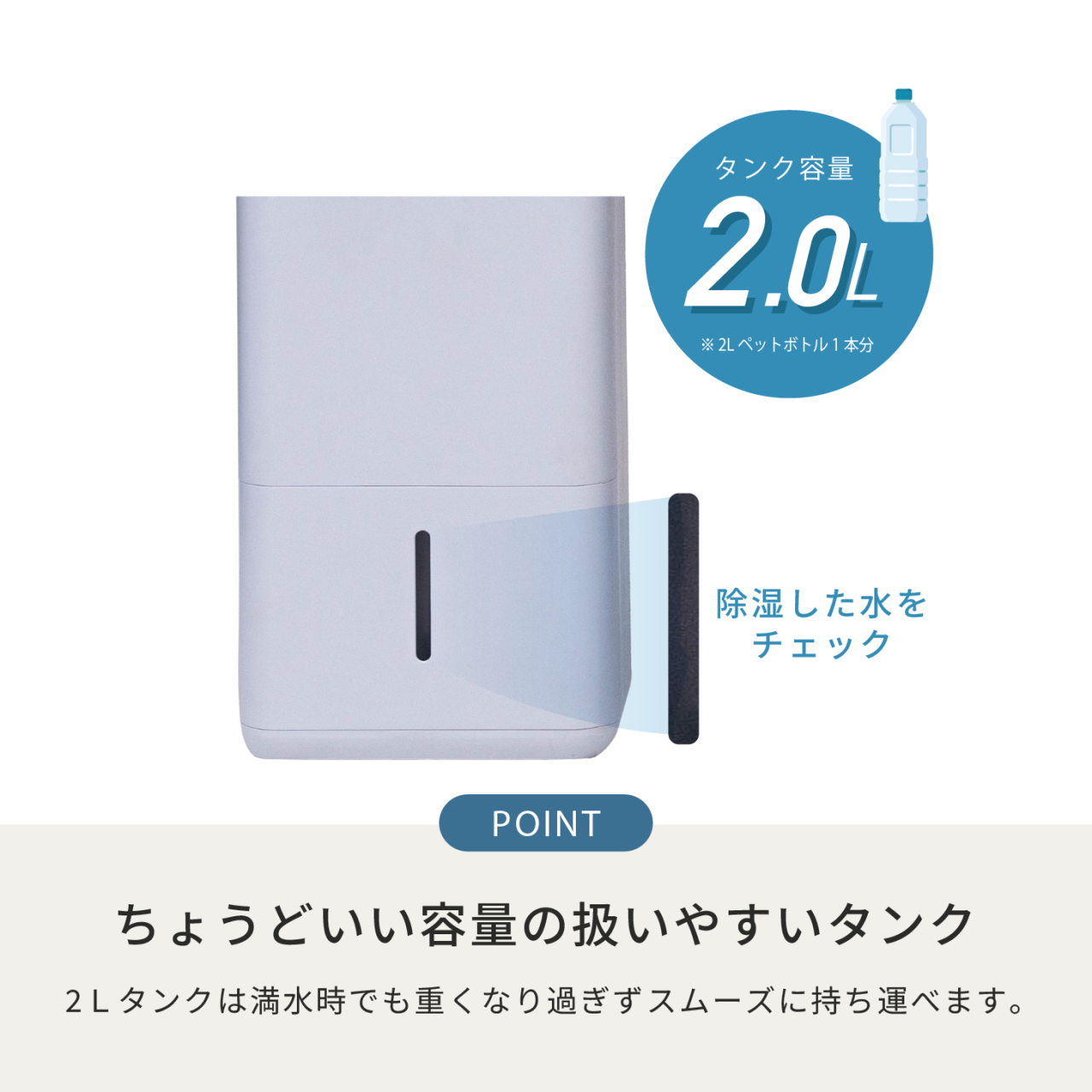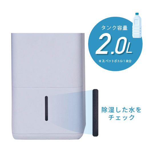 タンク容量は2.0L。大きすぎず扱いやすいサイズで、満水時でも重くなりすぎず持ち運びやすい設計です。日常的な排水作業の負担を抑えながら、快適に使用できます。