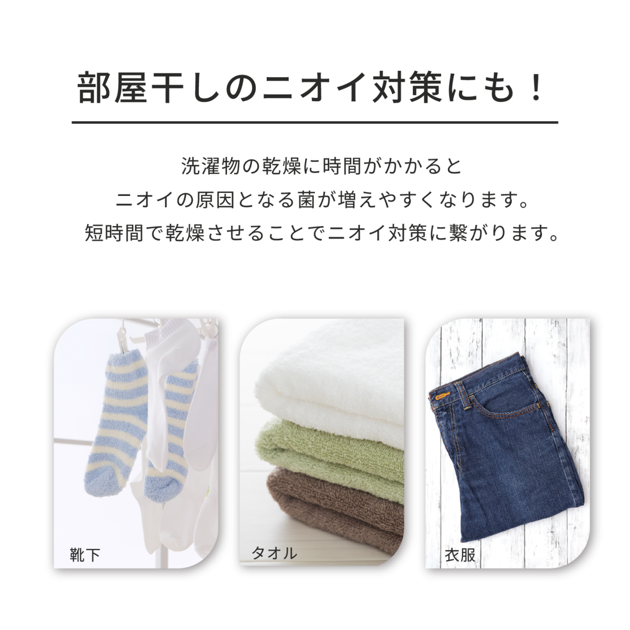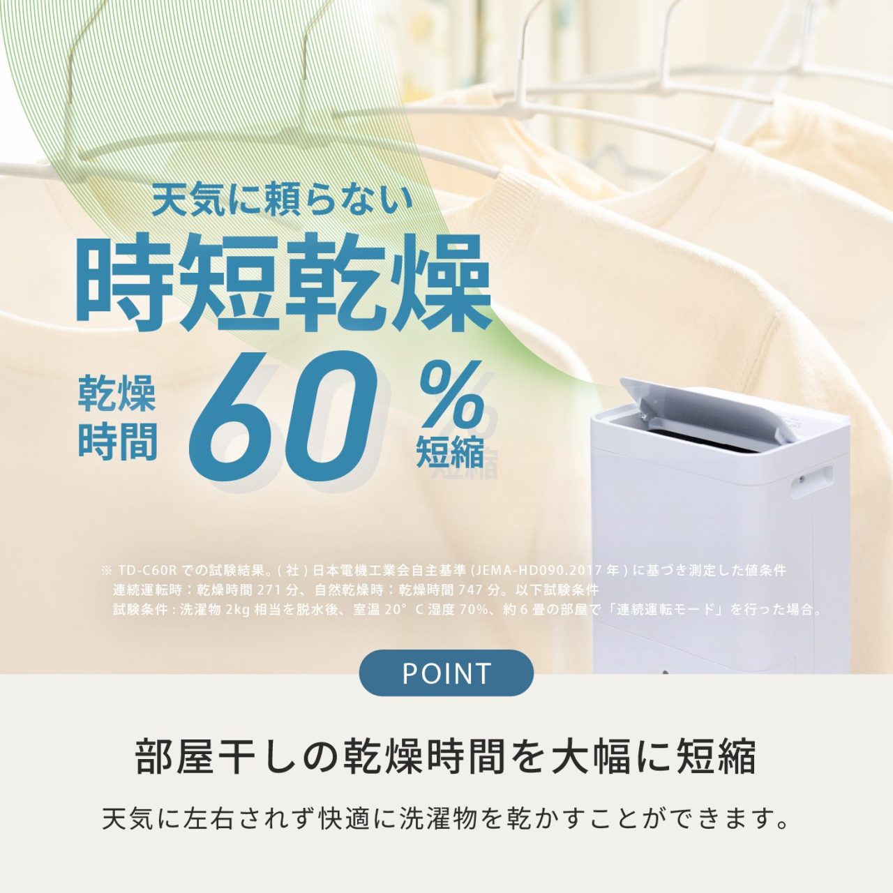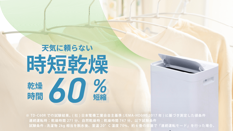 部屋干し特有のジメジメ感も抑え、室内の空気もすっきり。毎日の洗濯を、より快適で効率的にサポートします。