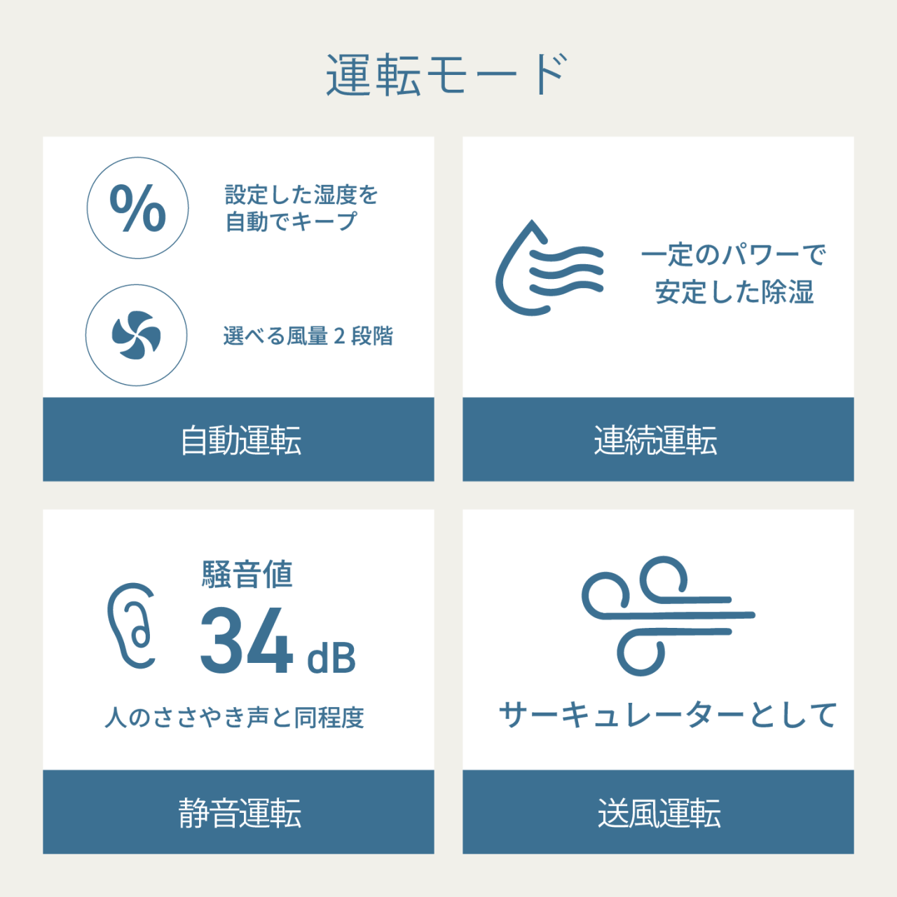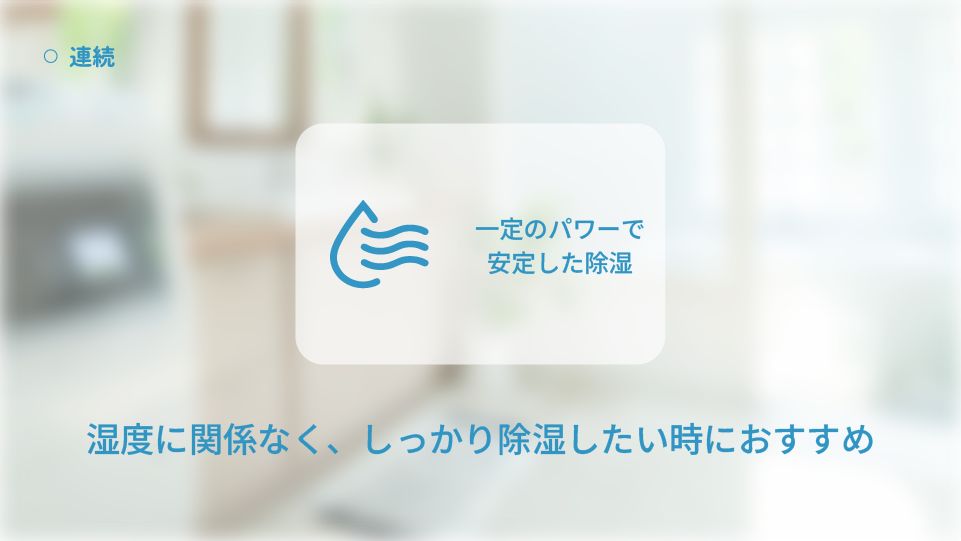 しっかり除湿したいときから静かに運転したいときまで、シーンに応じて使い分けが可能です。