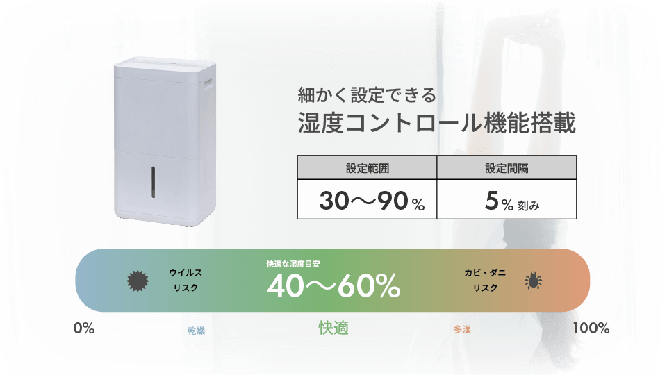 お部屋の湿度を 30~90%の範囲で5%刻みに細かく設定できます。