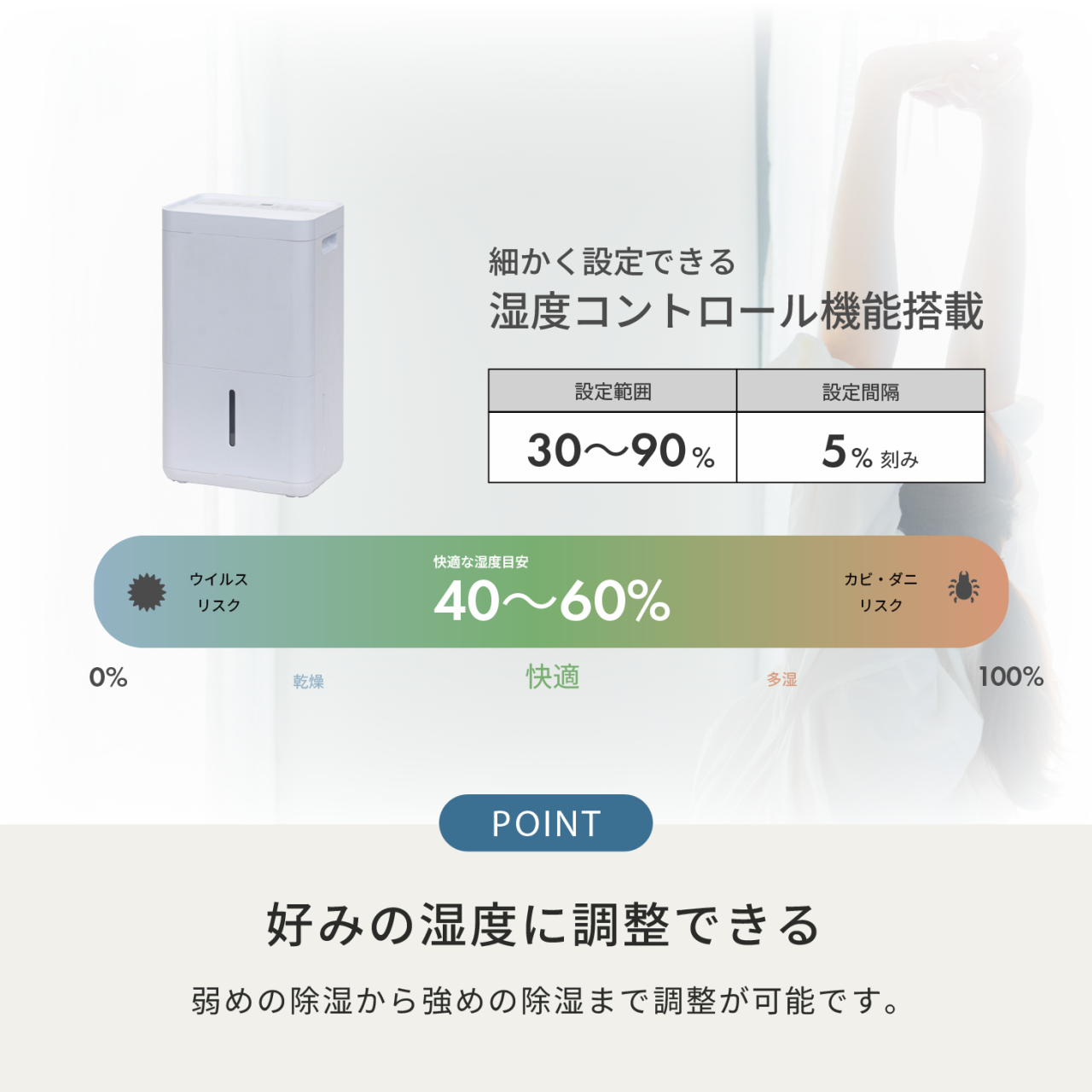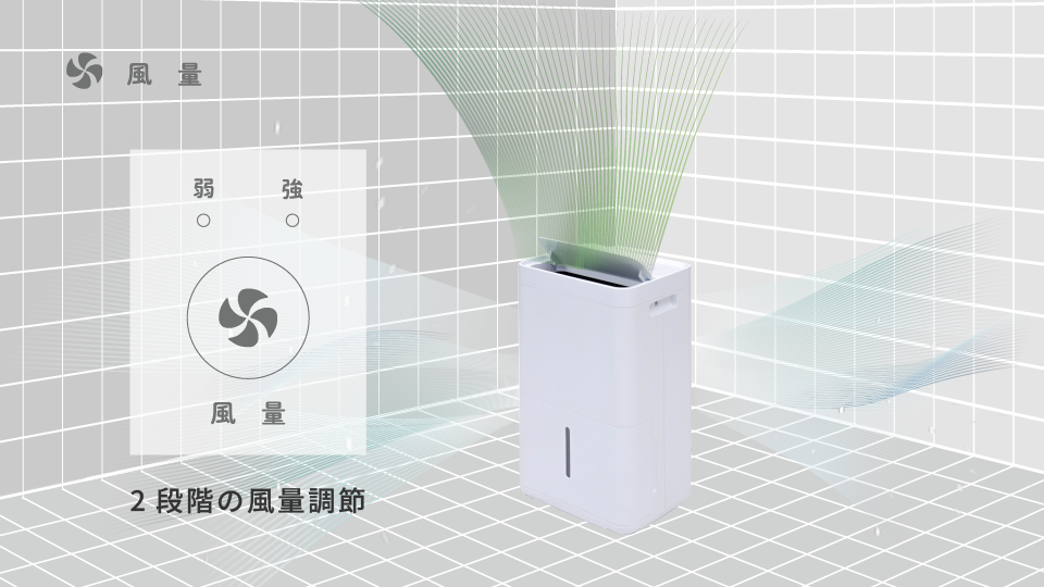 お好みや季節に合わせて、弱めの除湿からしっかり除湿まで調整が可能です。