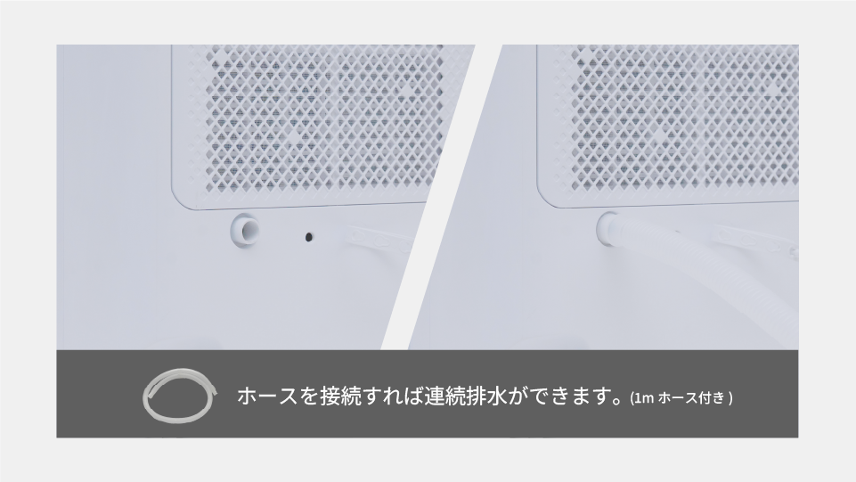 付属のドレンホース(1m)を接続することで、タンクに水を溜めずに排水できる連続排水に対応。