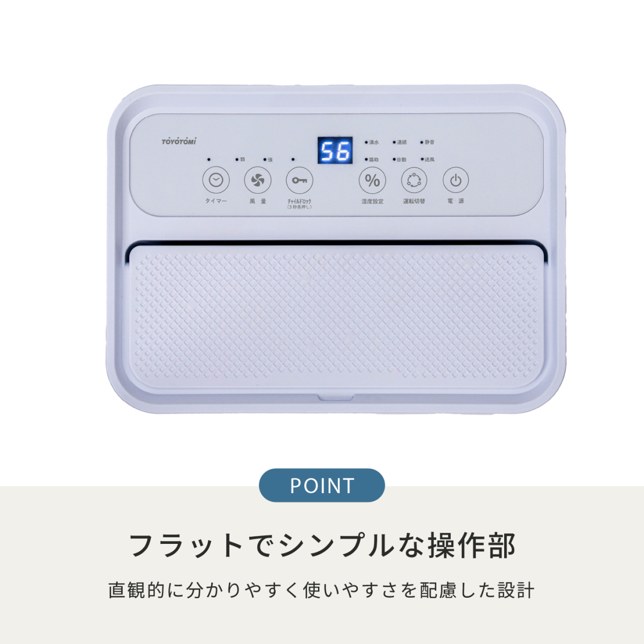 操作部は、見た目にもすっきりとしたフラットデザインを採用。本体と一体感のあるレイアウトで、空間に自然となじむシンプルな仕上がりです。