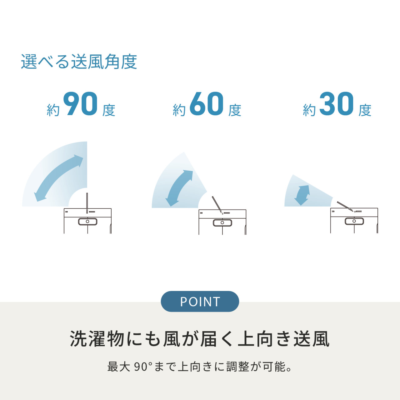 洗濯物に直接風を当てやすく、部屋干しの乾燥をサポートします。