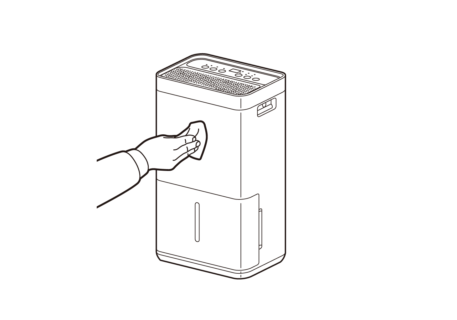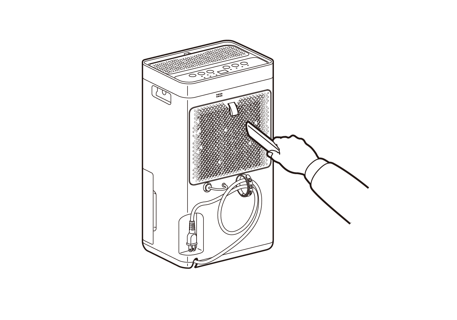 掃除機で本体の吸込口のほこりを吸い取ります。2週間に1回程度、お掃除してください。ほこりがたまると除湿能力が低下します