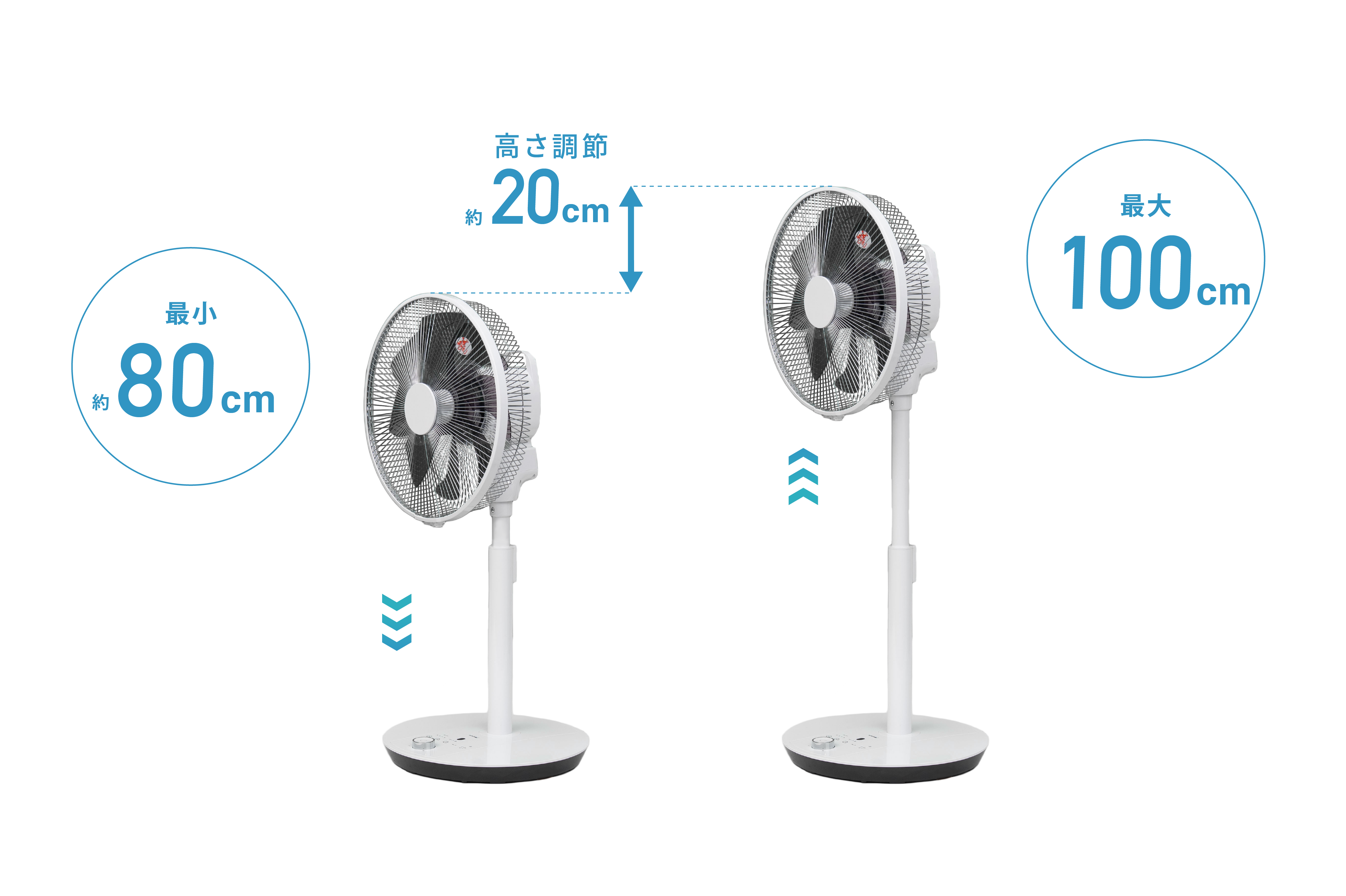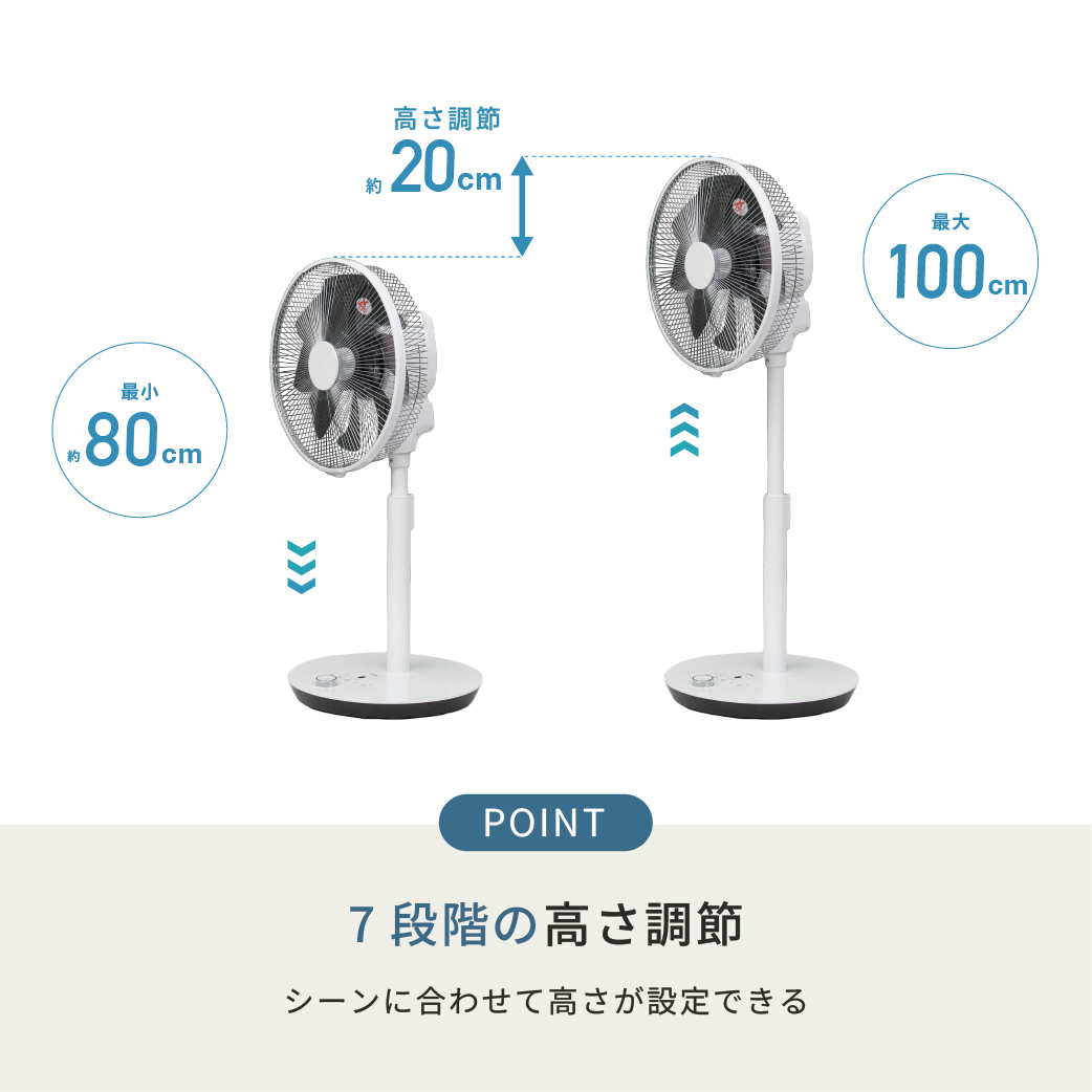 シーンに合わせて使える、7段階の高さ調節。高さは79.2cm~100cmまで調節可能。ソファ横やデスク下、洗濯物への送風など、使いたい場面にぴったりの高さで設定できます。お部屋や用途に合わせて、いつでも快適な風を。