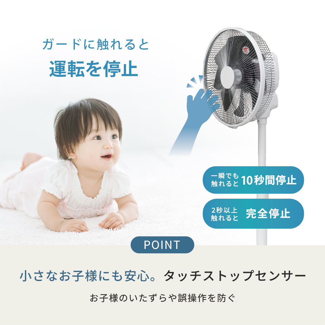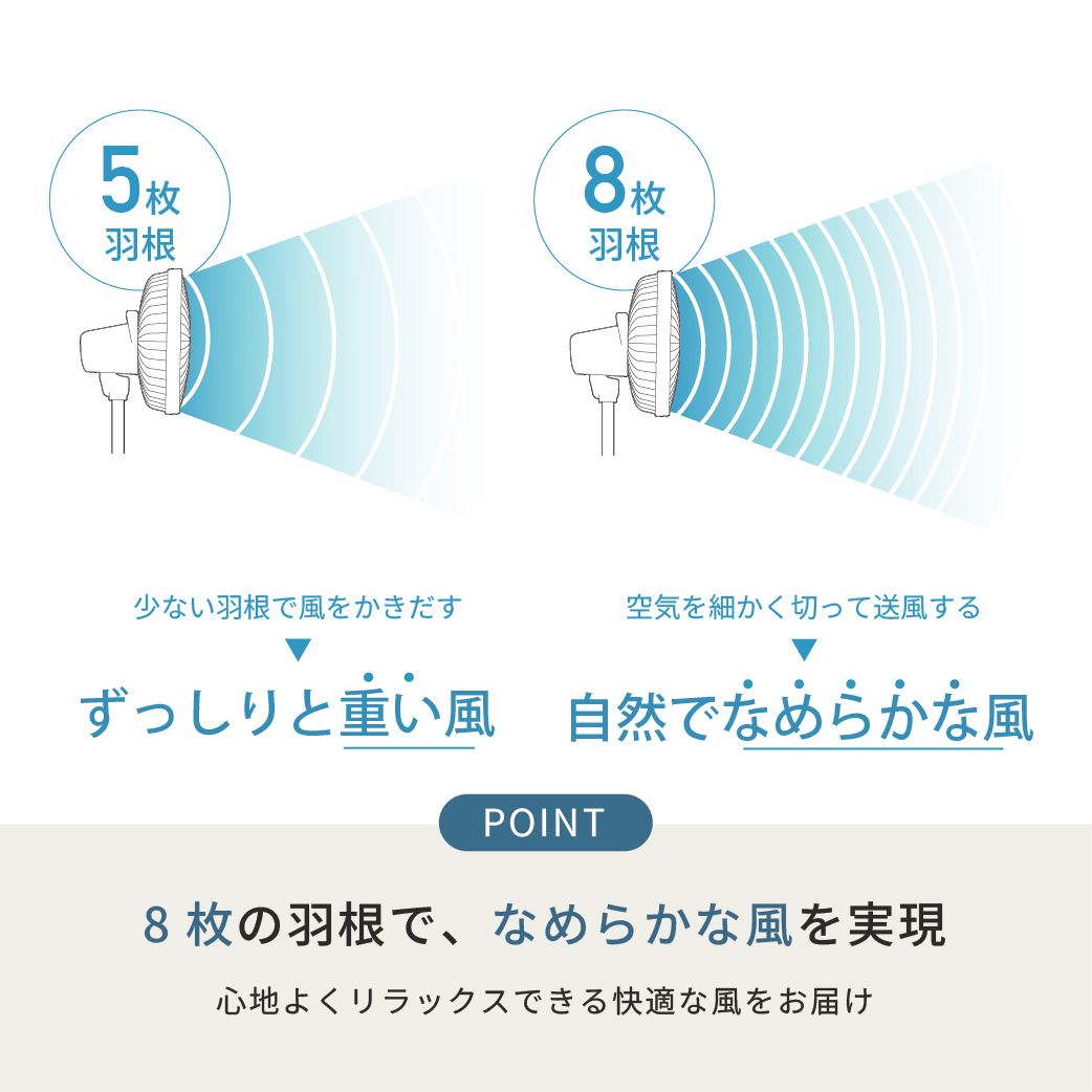 一方で、8枚羽根は空気を細かく切りながら送り出すことで、自然で柔らかな風を生み出します。包み込むような優しい風は、長時間当たっても体への負担が少なく、疲れにくいのが特長です。