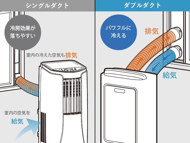 一方、シングルダクトは室内の空気を給気し室外に排気するため、冷えたお部屋の空気も一緒に排気されやすくなります。そのためダブルダクトと比べて冷房効果が低いです。