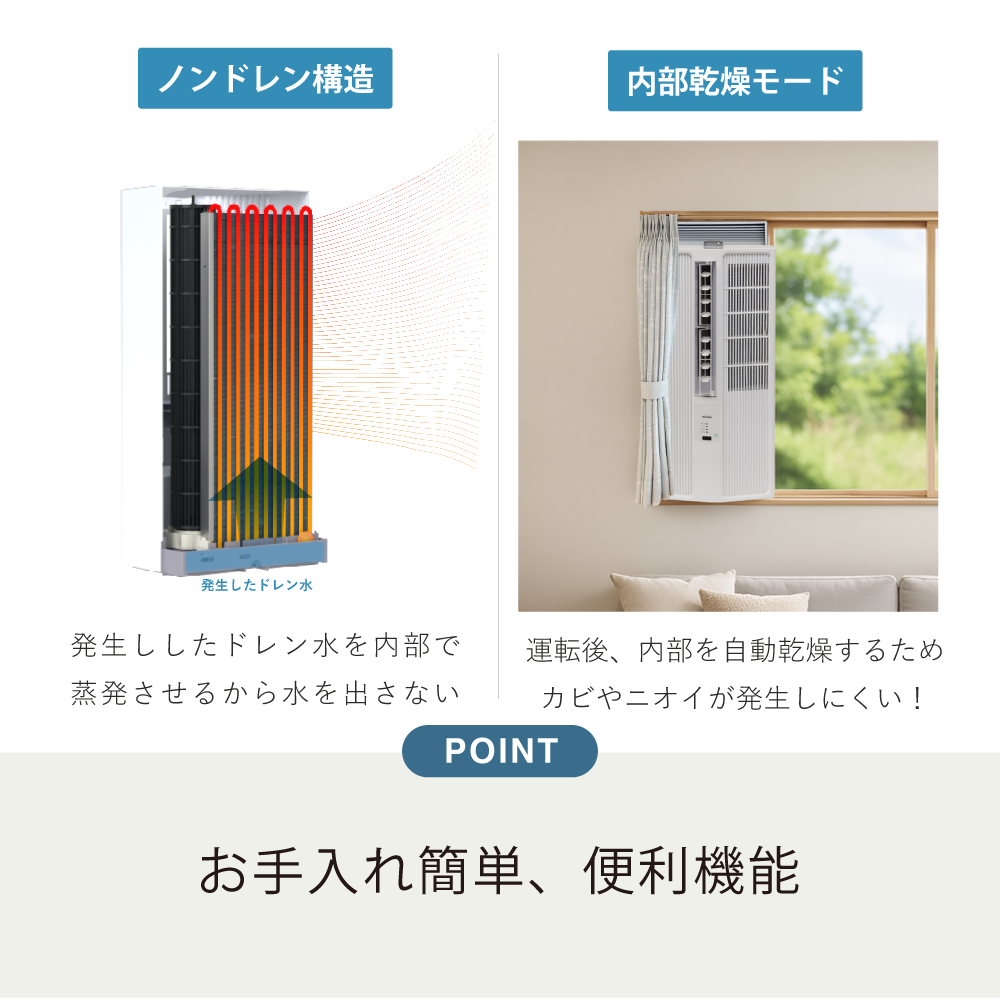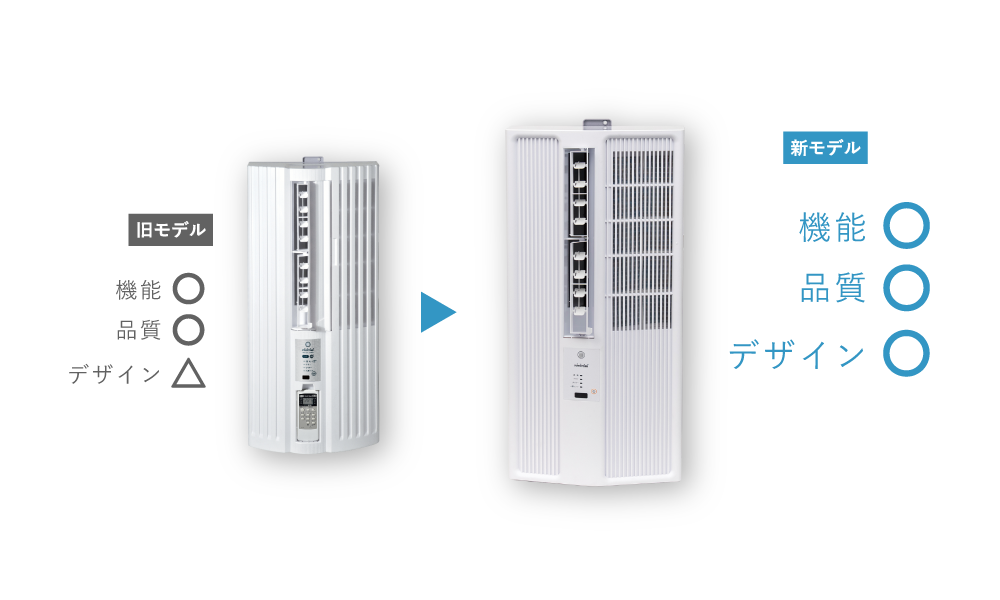 2026年、トヨトミの窓用エアコンは、使いやすさはそのままにデザインを刷新し、新たに生まれ変わりました。センター吹き出しによる快適な風の流れや、お手入れのしやすさといったこれまでの特長を受け継ぎながら、現代のインテリアに心地よく溶け込むデザインへ。