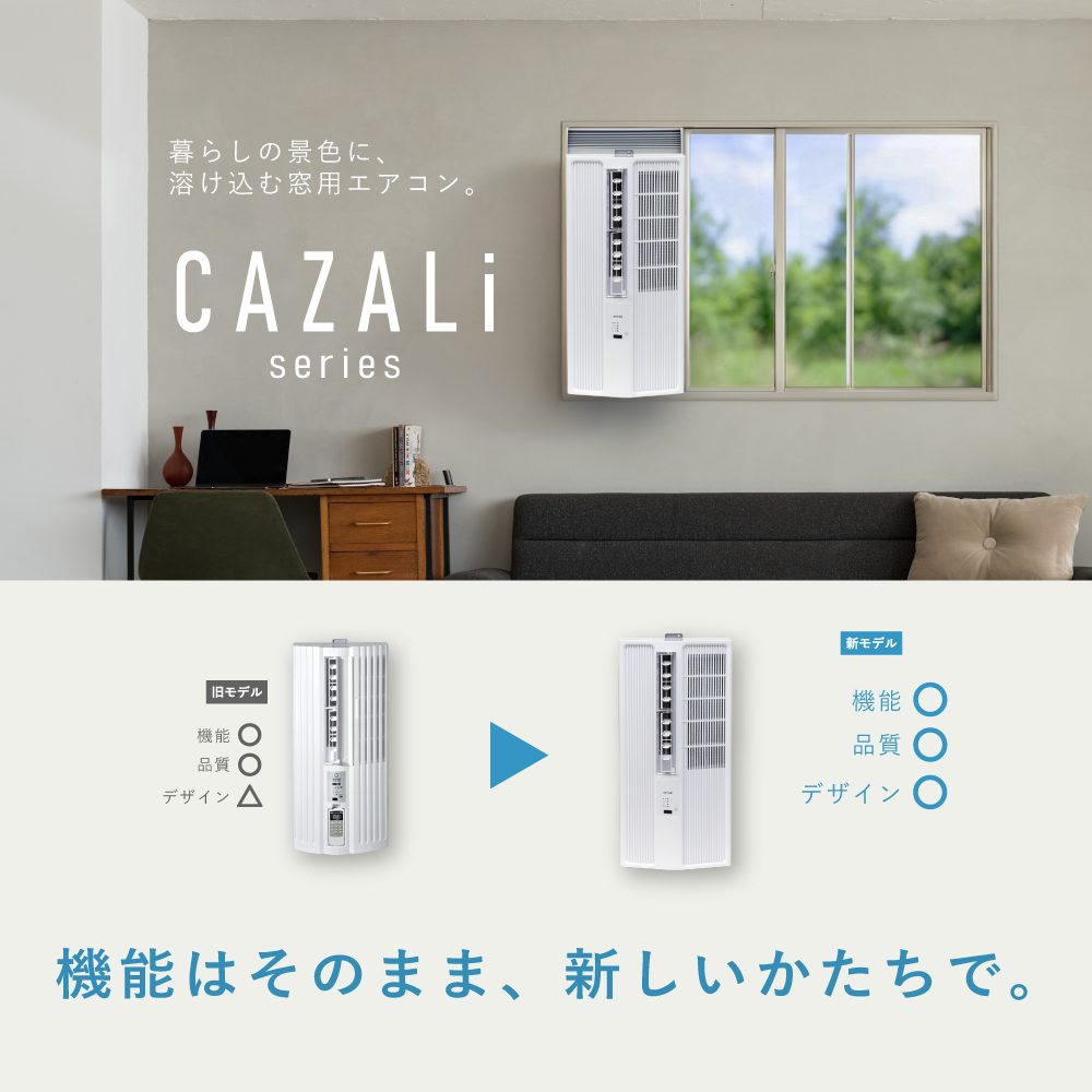 シリーズ名「CAZALi」は、“窓を着飾る”という言葉に由来しています。窓辺をただの設置場所ではなく、暮らしを彩る景色の一部へ。CAZALiシリーズは、快適さと美しさを兼ね備えた窓用エアコンです。