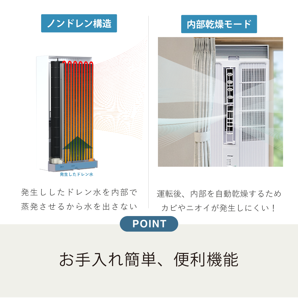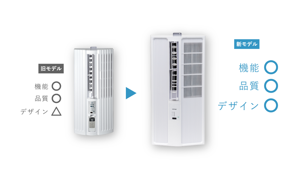 2026年、トヨトミの窓用エアコンは、使いやすさはそのままにデザインを刷新し、新たに生まれ変わりました。センター吹き出しによる快適な風の流れや、お手入れのしやすさといったこれまでの特長を受け継ぎながら、現代のインテリアに心地よく溶け込むデザインへ。