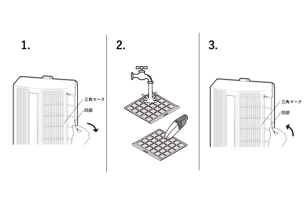 プレフィルターにほこりがたまると、空気の通りが悪くなり冷房能力が低下します。2週間に1度を目安に掃除を行ってください。