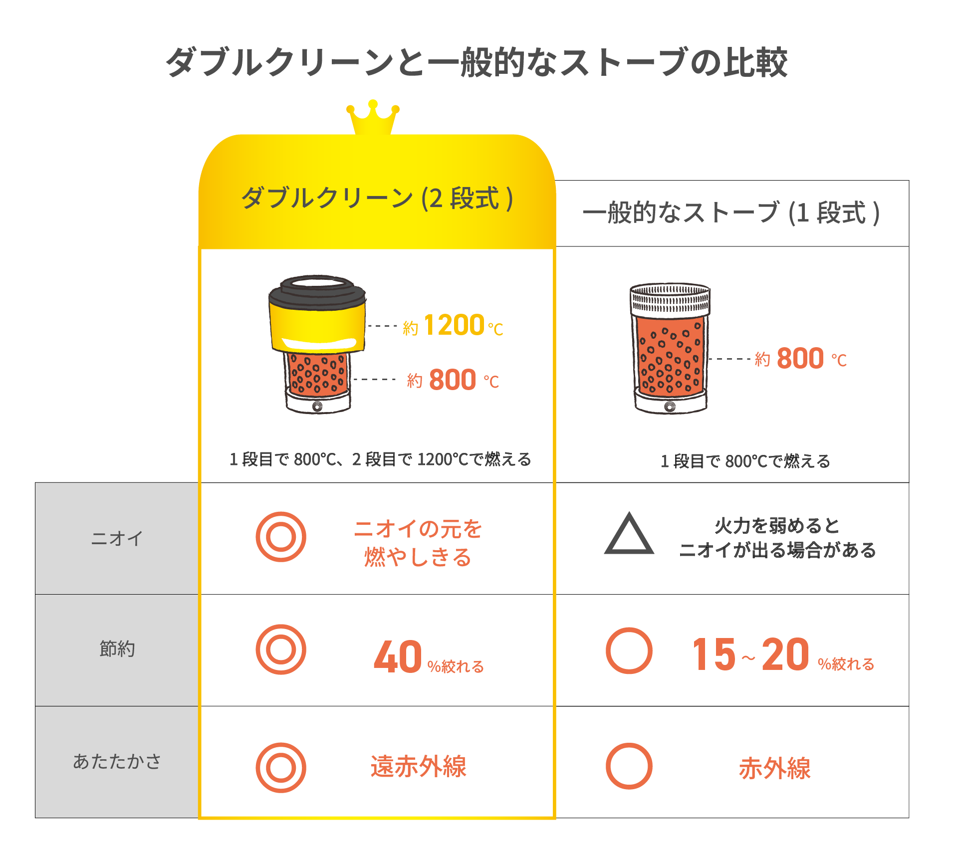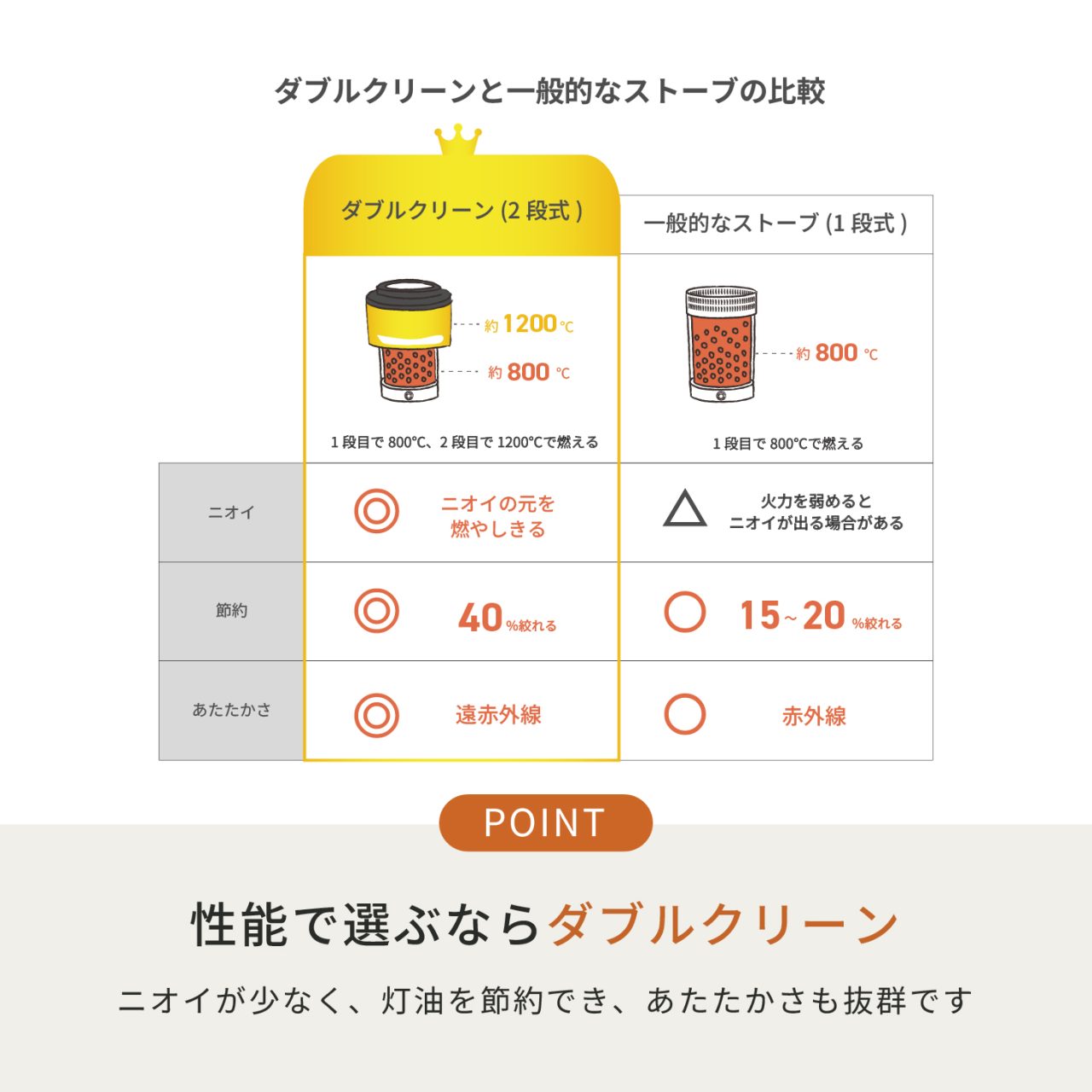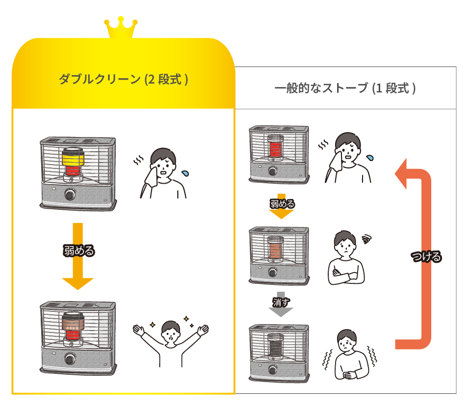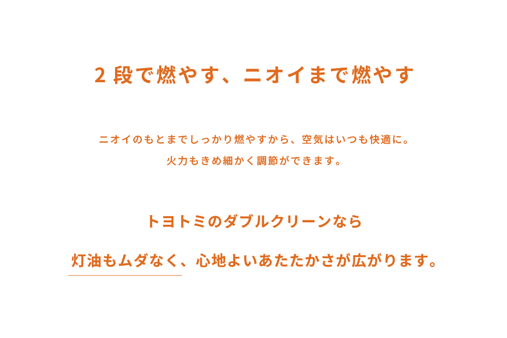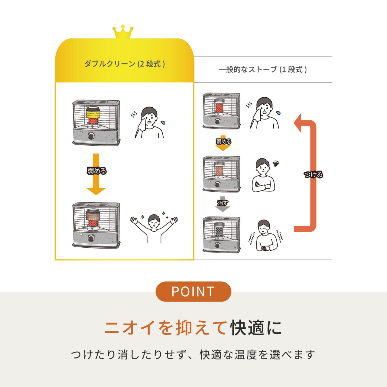 ダブルクリーンなら40%の火力調節幅があるので、火力を弱めてもニオイは出ません、つけたり消したりしなくてもよいので、快適で灯油のムダ使いを省きます。
