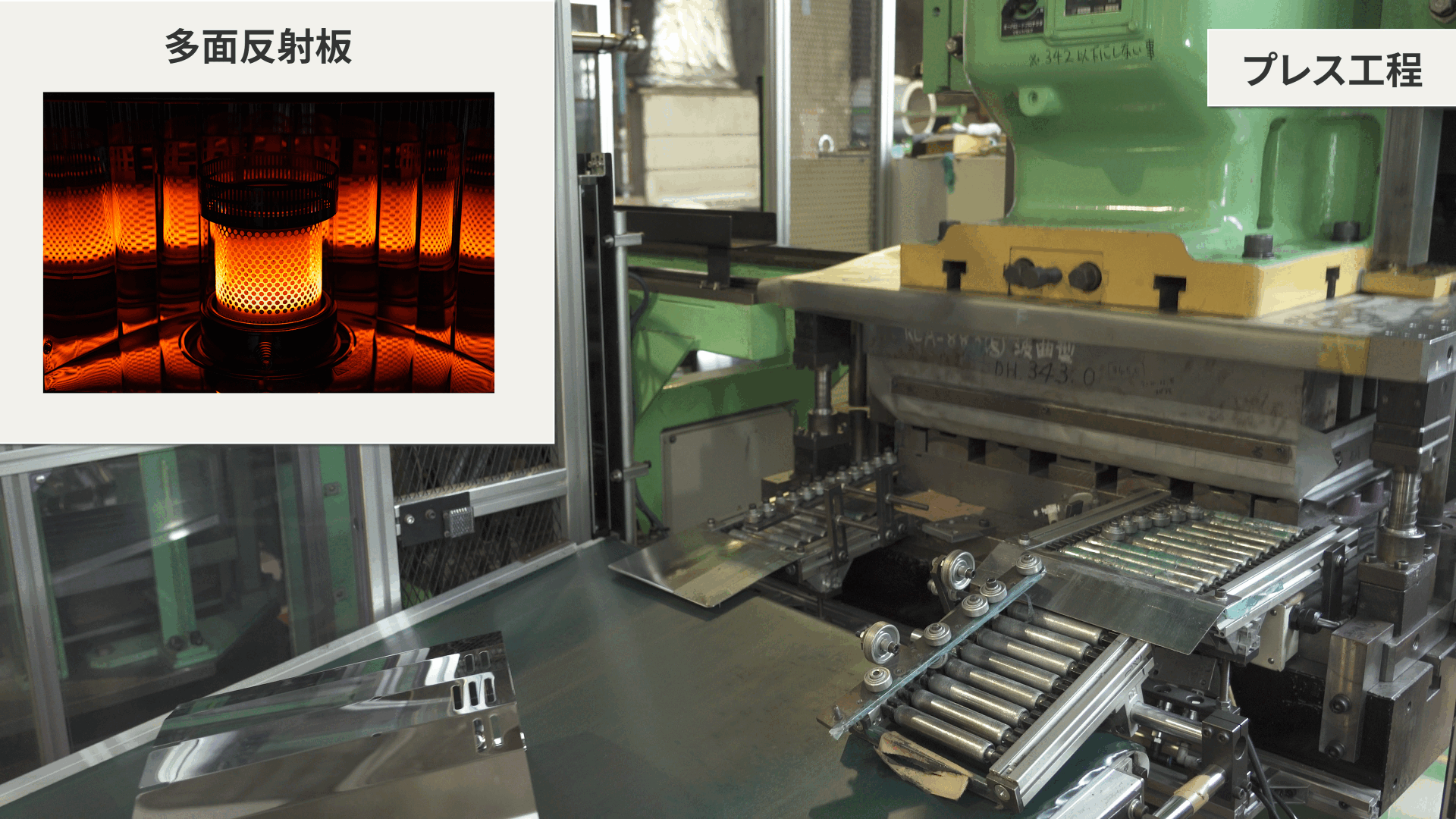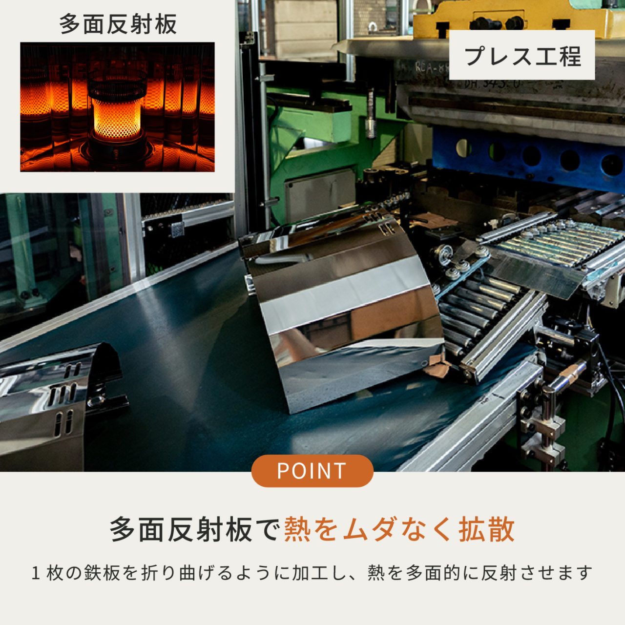 トヨトミの石油ストーブに採用されている多面反射板は、1枚の鉄板をプレス加工によって、いくつもの角度をつけて折り曲げるように加工します。この加工によって、石油ストーブの燃焼筒から当たった熱がいろんな方向へ乱反射して拡散していきます。ムラがないように前面に向かって広範囲に熱を拡散するので、より効果的に部屋を暖める事が出来ます。