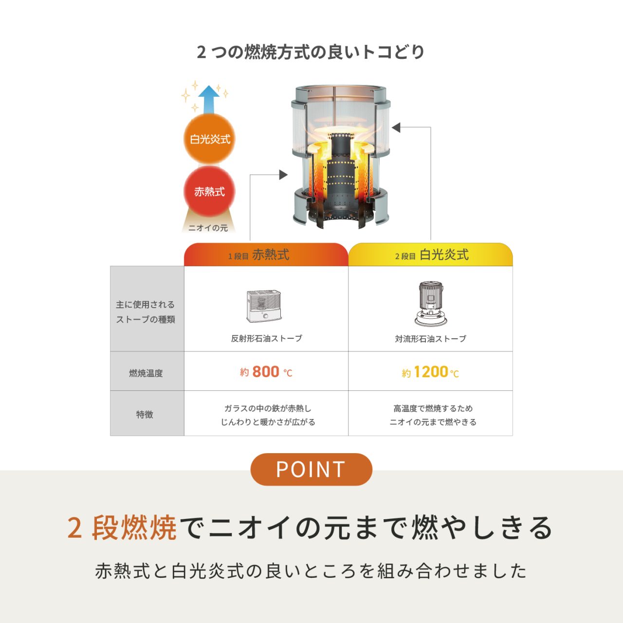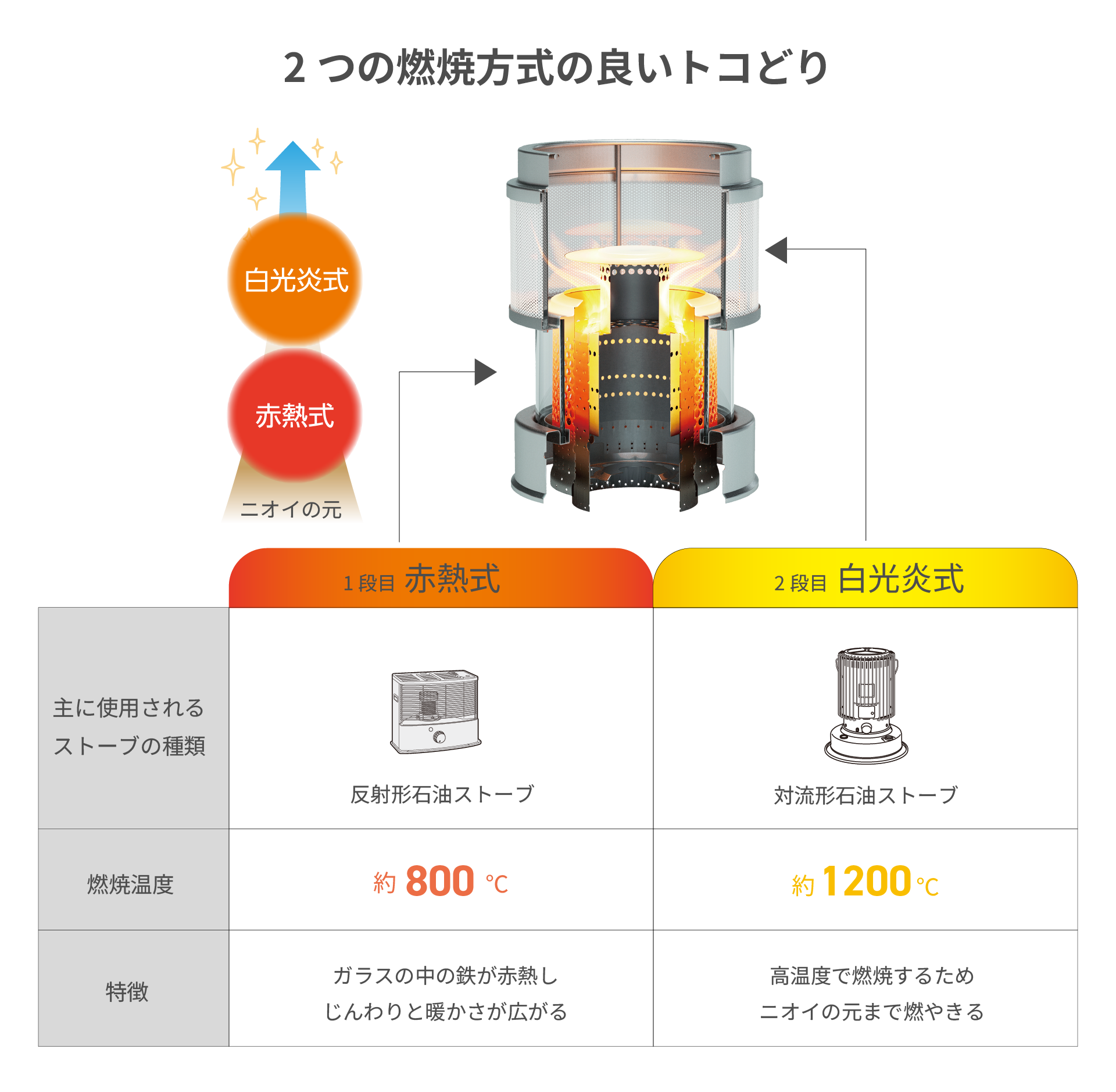 2段目の白光炎式は対流形石油ストーブに使われている燃焼方式。1段目より高温の約1200℃まで燃えるので、1段目で燃えきらなかったニオイの元を燃やしきります。