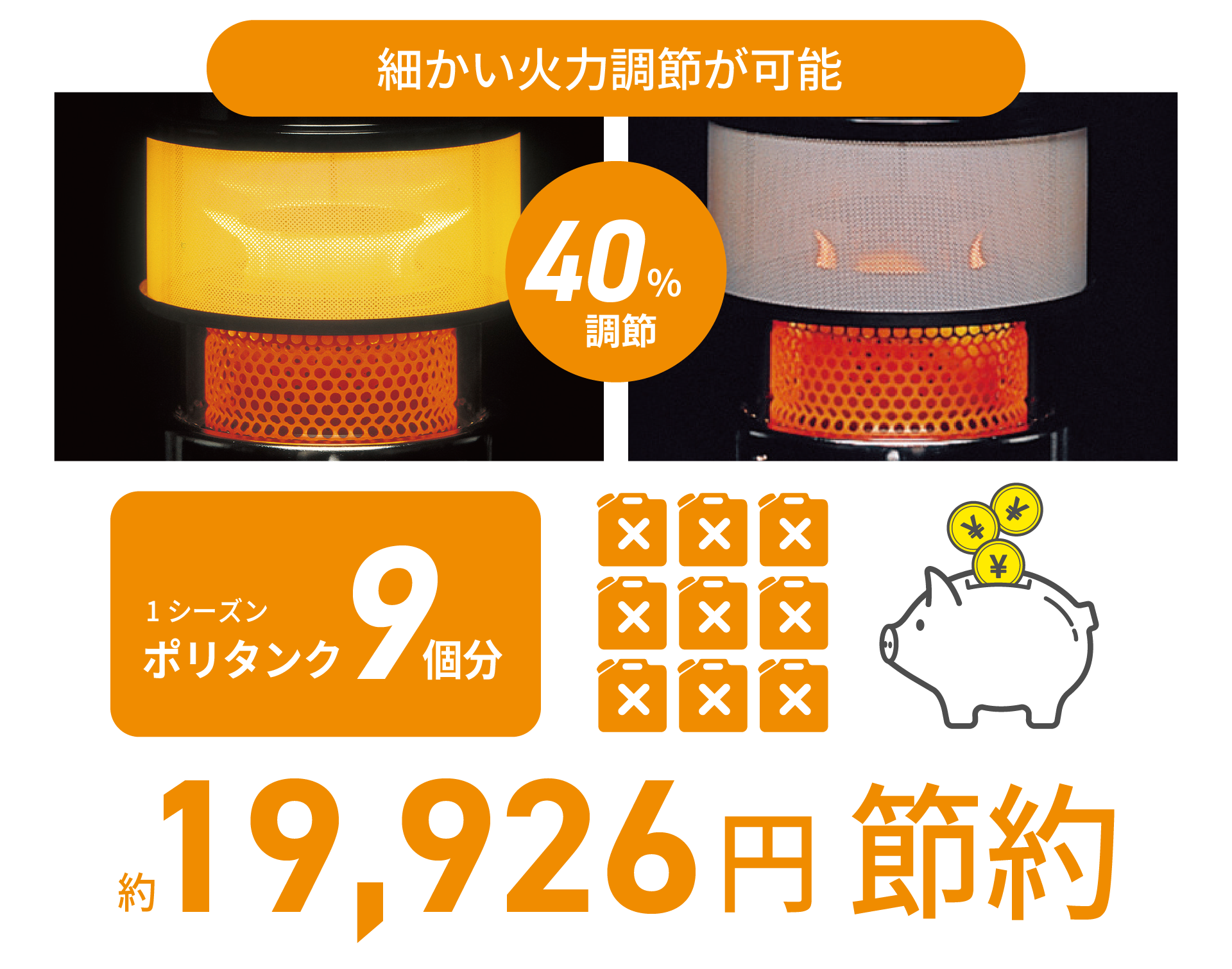 細かい火力調節ができるので1シーズンでポリタンク約9個分の節約ができます。年間を通じてご使用いただくことで、十分に灯油を節約しながら使うことができます。