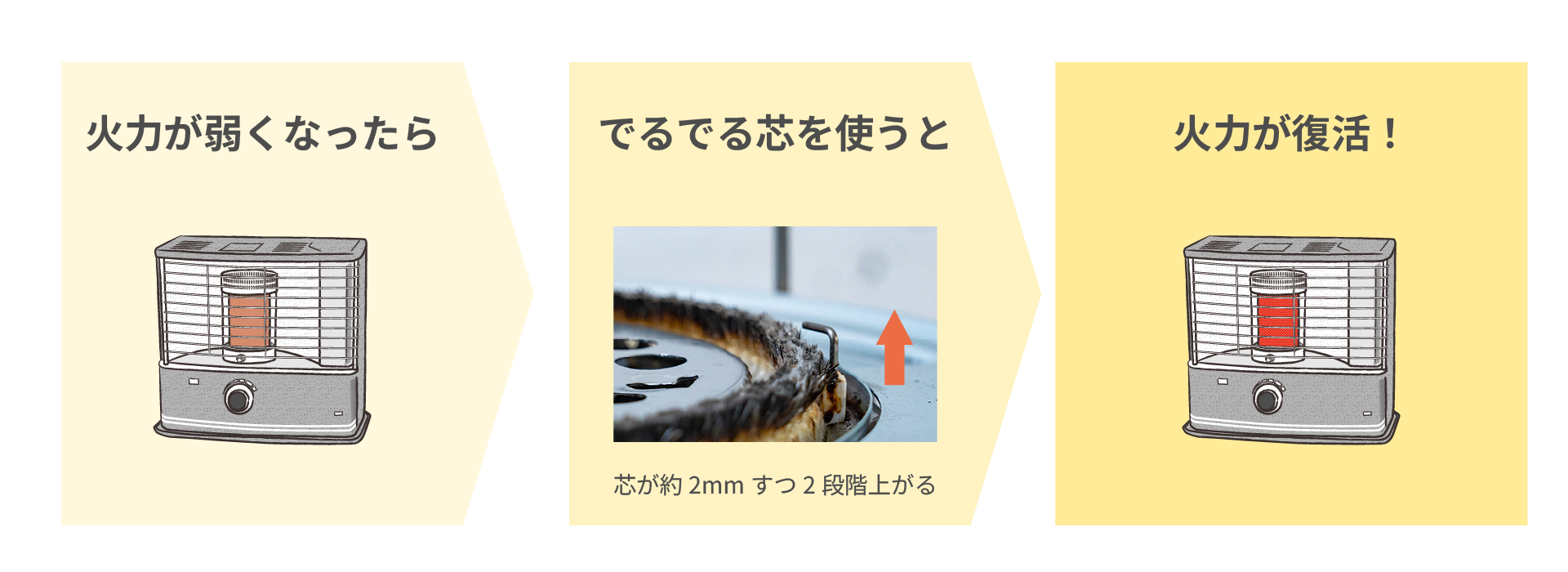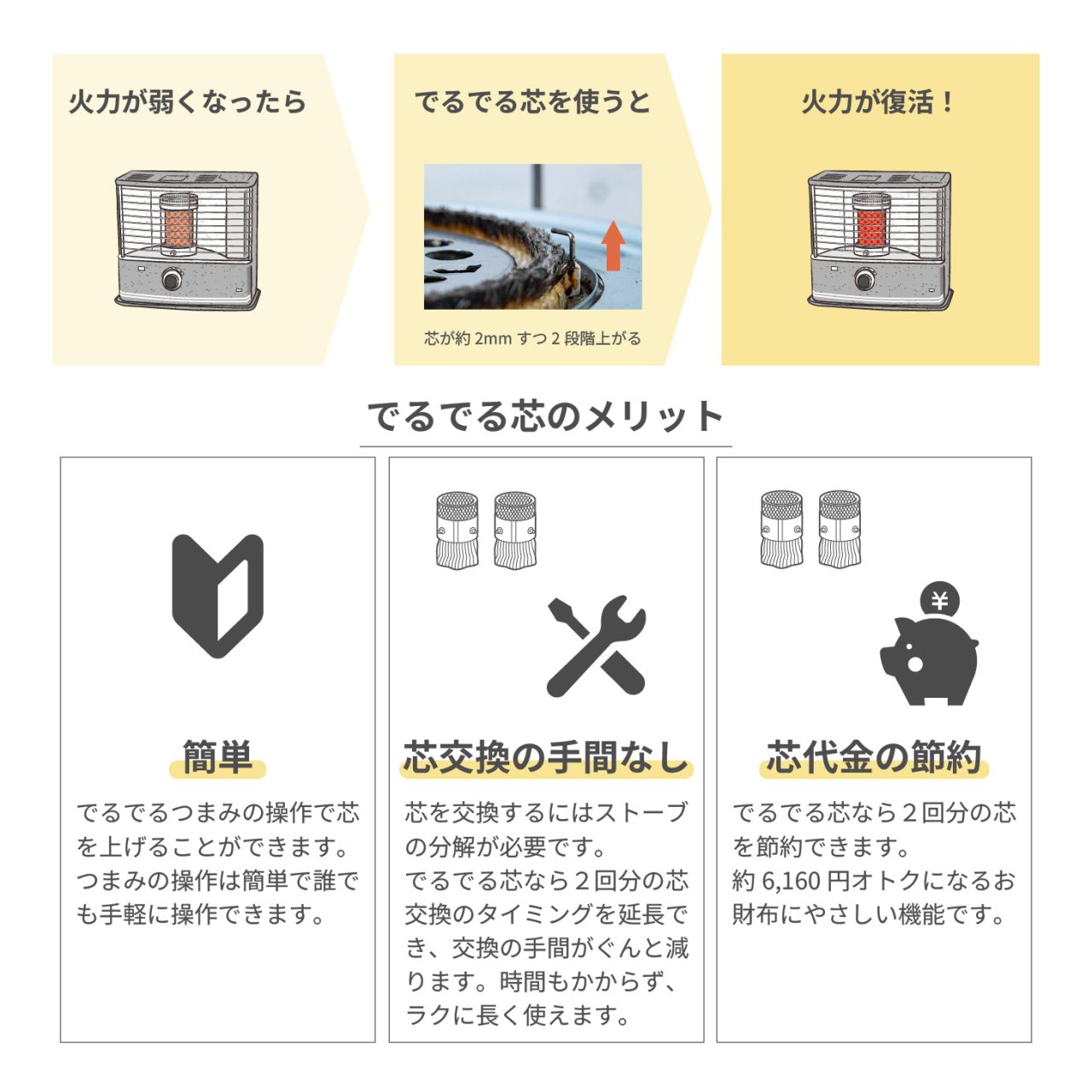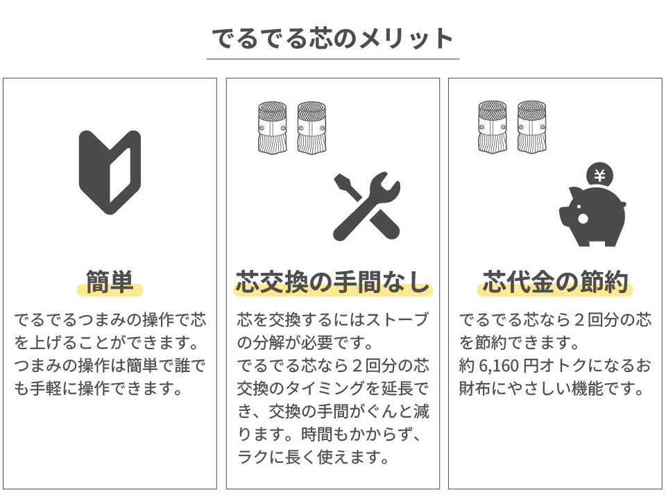 芯交換の手間なし:芯を交換するにはストーブの分解が必要です。でるでる芯なら2回分も芯の交換のタイミングを延長でき、交換の手間がぐんと減ります。時間もかからず、ラクに使えます。