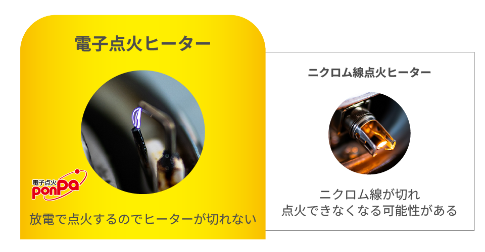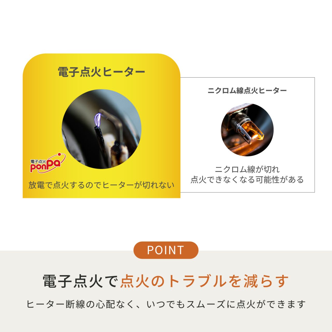 トヨトミの石油ストーブには電子点火を採用しています。電子点火は、点火ツマミを回すと放電が起こり、素早く芯に点火させます。従来の石油ストーブはニクロム線の点火ヒーターを採用し、断線のトラブルがありましたが、電子点火なら断線の心配がなく点火はスムーズです。点火する時ピーという放電音がするので点火動作の合図にもなります。