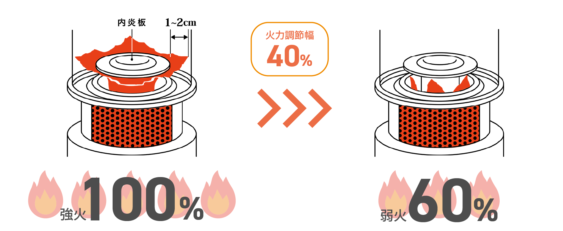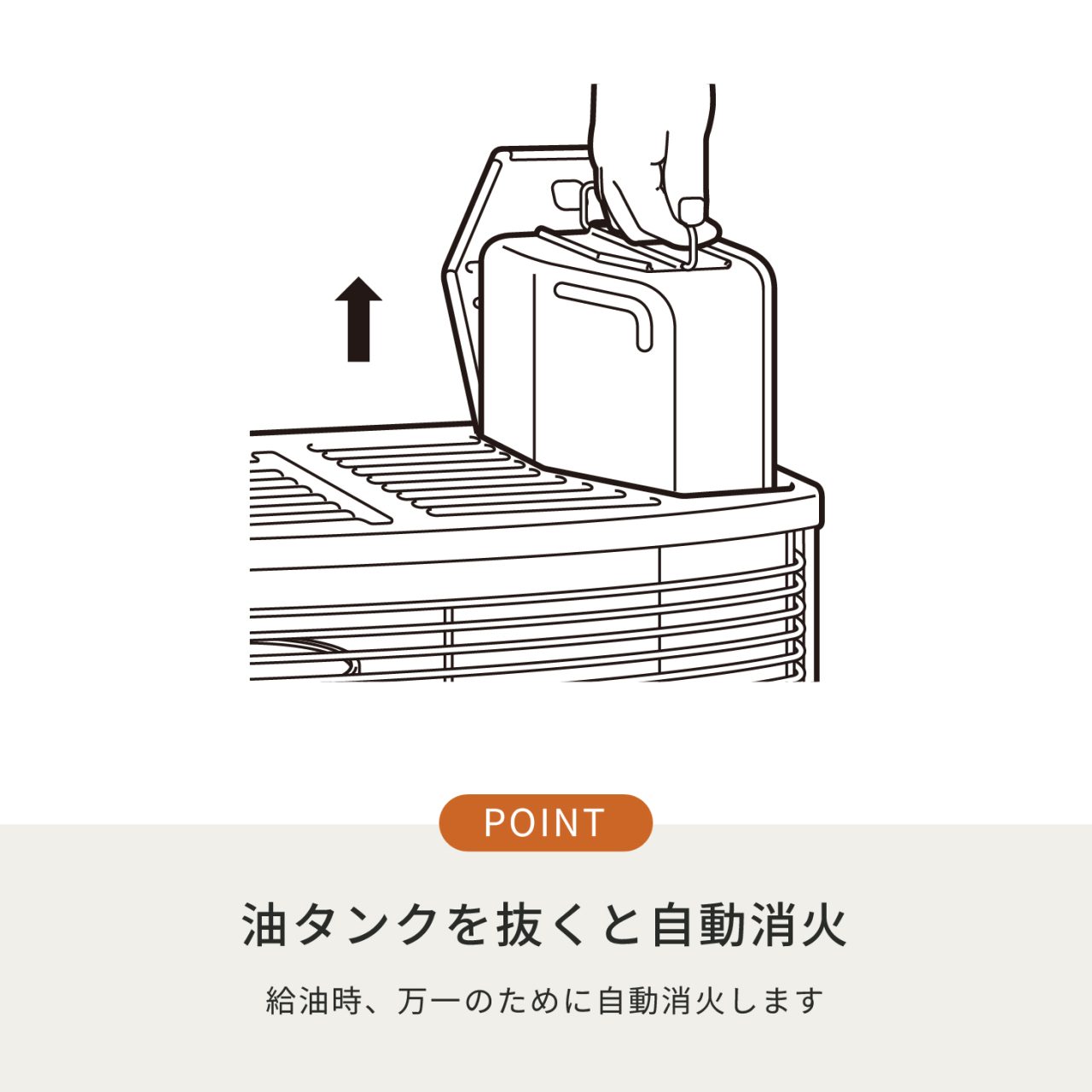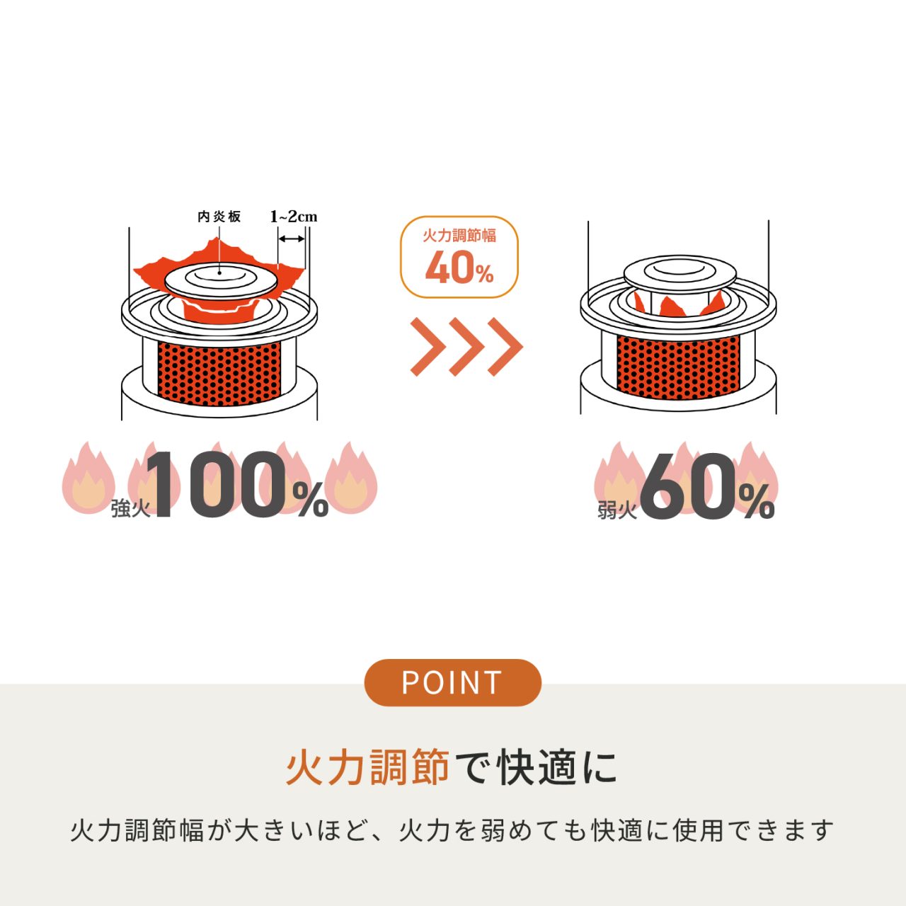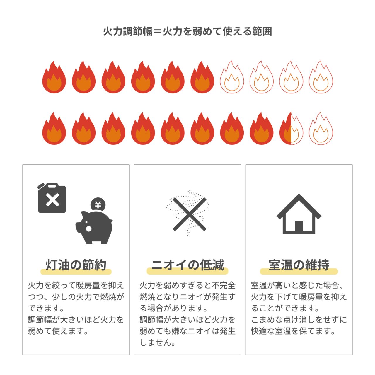その調節幅は機種によってそれぞれ違いがありますが、火力調節幅のパーセントが大きいものほど柔軟な温度調節ができて、より快適に過ごすことができます。また火力を弱め過ぎると不完全燃焼となりニオイが発生する場合があるので、火力調節幅が大きい機種の方が火を弱めても嫌なニオイは発生しません。火力調節幅は、灯油の節約、ニオイの低減、室温の維持能力などに関わる機能です。