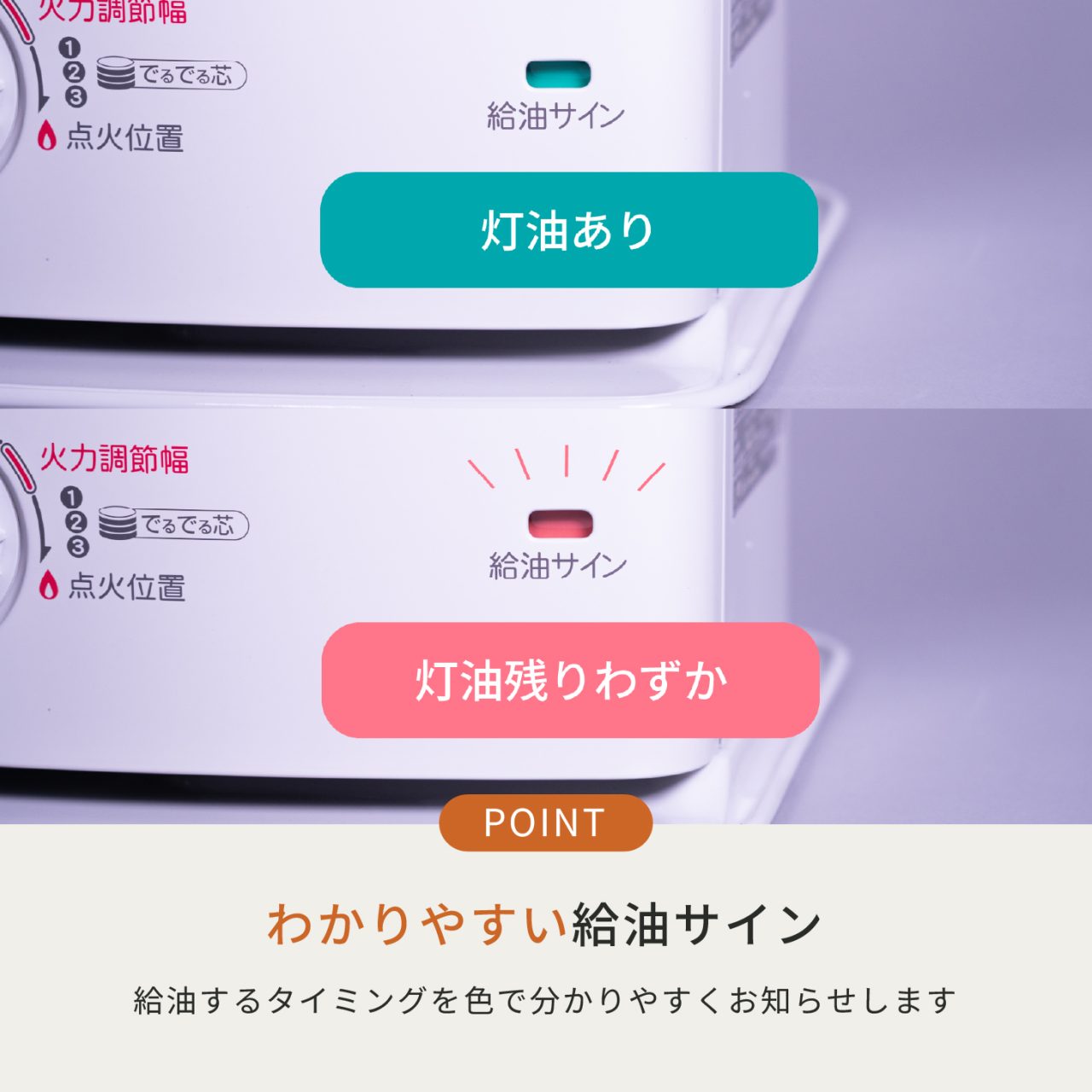 ダイヤルの右側に位置する給油サインは、給油するタイミングを色で分かりやすくお知らせする機能です。灯油残量が満タンの時は緑色に、灯油残量が少ないときは赤色に変わります。