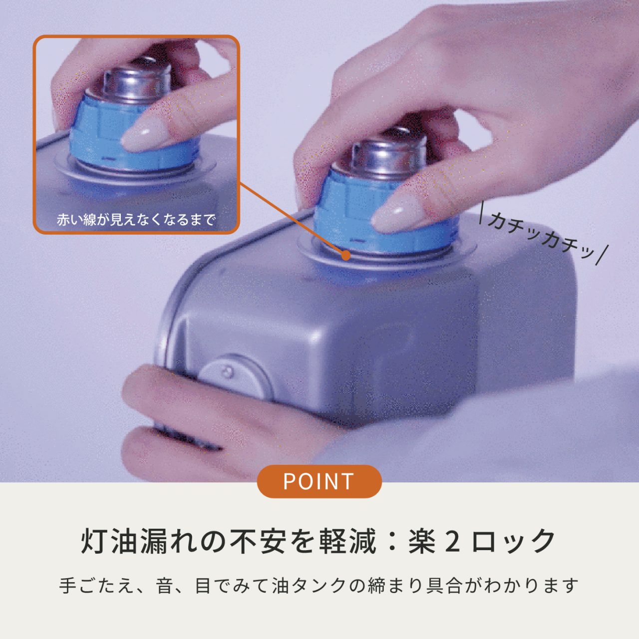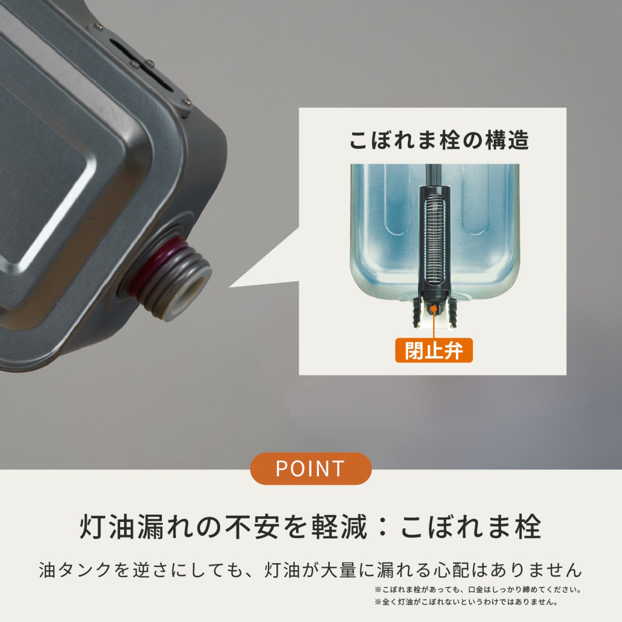 こぼれま栓とは「逆止弁」によって灯油漏れを防止する機能です。万が一、キャップの閉め忘れやゆるみがあるままひっくり返しても、大量に灯油がこぼれてしまうということがありません。