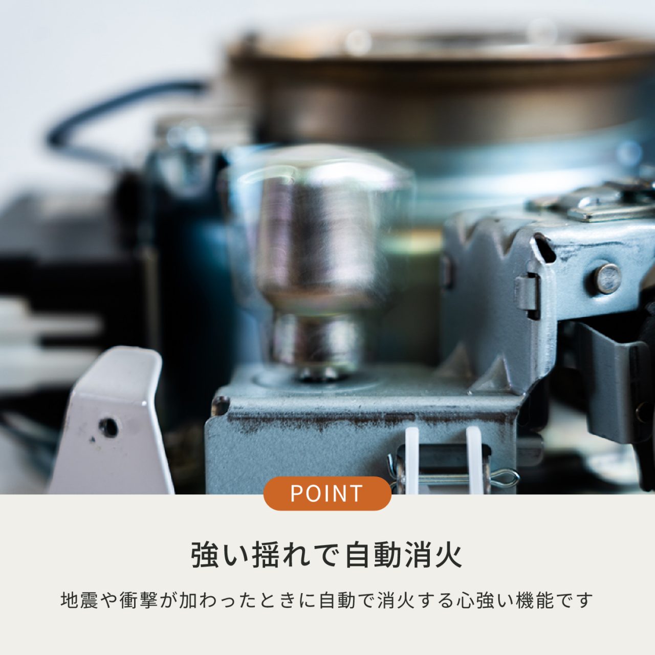転倒などによる火災を防止するための保護にもなります。点火つまみを回す(またはレバーを下げる)だけで、自動でセットされる仕組みなので、もしもの時に「セットし忘れてた」なんて心配もなく、どんな時にも心強い機能です。